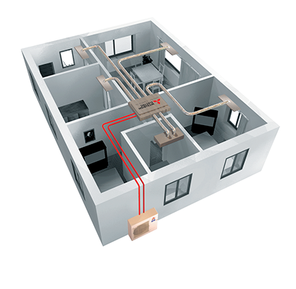 L’air est ensuite redistribué à l’aide d’un réseau de gaines partant du gainable vers les différentes pièces à traiter. Dans chacune de ces pièces, l’air est diffusé via une grille d’aération.