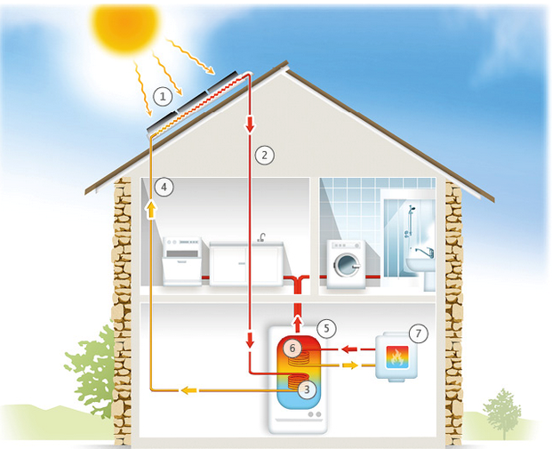 Un système solaire thermique exploite le rayonnement du Soleil afin de le transformer directement en chaleur (énergie calorifique). La chaleur est ensuite utilisée afin de produire de l’eau chaude sanitaire.