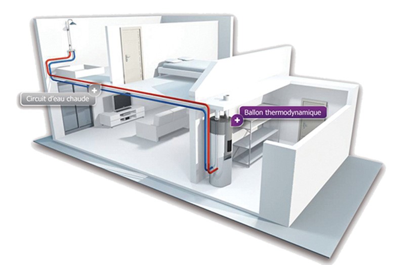 Cette pompe à chaleur récupère les calories naturellement présentes dans l’air pour chauffer l’eau du ballon et donc l’eau sanitaire.