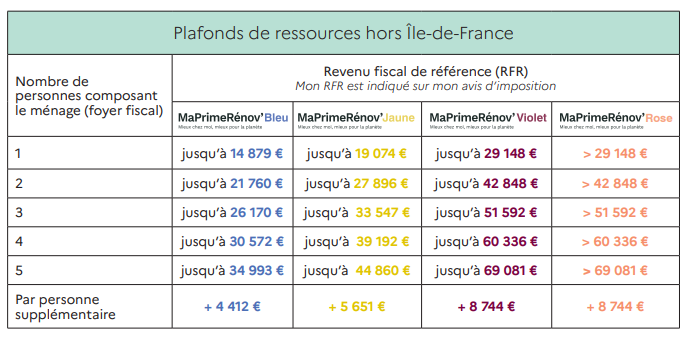 MaPrimeRénov’ dépend des ressources du foyer et du nombre de personnes du ménage.