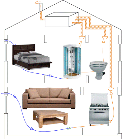 Il n’y a pas de mélange entre l’air extrait et l’air soufflé, il n’y a qu’un échange de chaleur. L’air est extrait dans les pièces dites de service : cuisine, salle de bain, wc, cellier… toutes les pièces disposant d’un point d’eau. L’air est soufflé dans les pièces dites principales : salon, salle à manger, bureau, chambre…